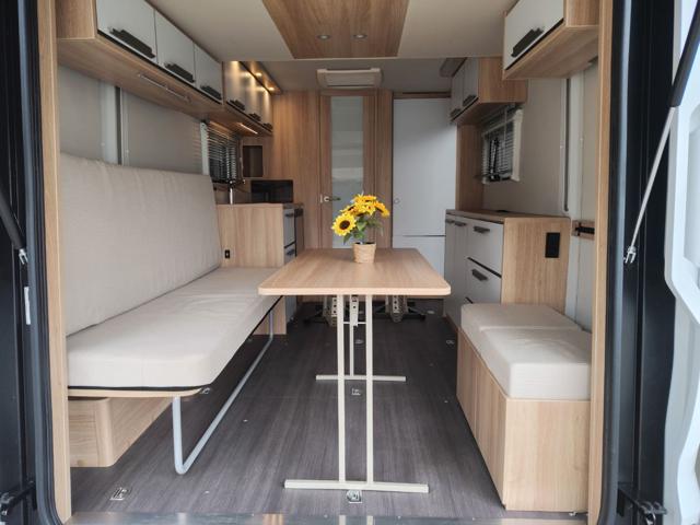 Knaus descrive il Deseo 400 TR prima di tutto come uno spazio abitativo accogliente, dotato di tutti i comfort che ci si aspetta da tutti i camper arredati: una cucina completa, un bagno, una dinette/letto convertibile e quattro posti letto quando si aggiunge il letto rialzato sollevabile. Una delle caratteristiche migliori del Knaus Deseo è la sua rapida conversione in modalità stiva. Ora puoi portare la tua moto e fare bella figura davanti a tutti. L'intero pannello posteriore si solleva per creare un'unica grande porta, così puoi aprirla sulla spiaggia e ammirare un panorama già pronto, per gentile concessione della natura.